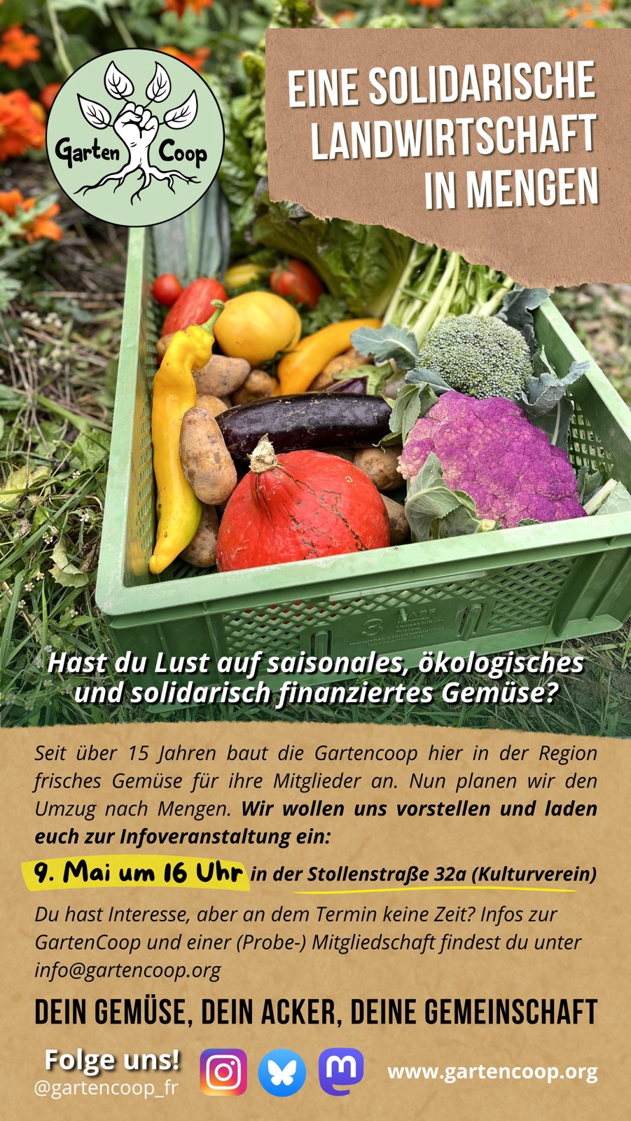 Seit über 15 Jahren baut die Gartencoop hier in der Region frisches Gemüse für ihre Mitglieder an. Nun planen wir den Umzug nach Mengen. Wir wollen uns vorstellen und laden euch zur Infoveranstaltung ein: