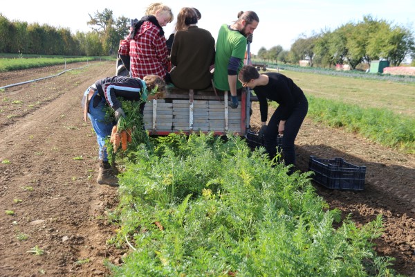 Jeweils donnerstags wird das morgens frisch geern tete Gemüse und das Lagergemüse aus dem Keller verteilt. Zwei Mitglieder wiegen und verstauen die Produkte in die NapfKisten. Ein Mitglied kocht für alle. Mittags kommt ein CarsharingAuto und bringt die Kisten zum Umschlagsplatz nach Freiburg. Von dort transportieren Mitglieder per Fahrrad die Kis ten zu 16 Verteilpunkten. Dort informieren Listen, wie viel Kilo Möhren, Tomaten oder Kartoffeln je dem Haushalt zustehen. Unabhängig davon, wie viel der Einzelne monatlich beisteuert – Richtwert sind 100 Euro – wird alles gleichmäßig aufgeteilt. Gutver diener zahlen mehr, Geringverdiener weniger – man che bringen mehr Zeit ein, andere weniger.