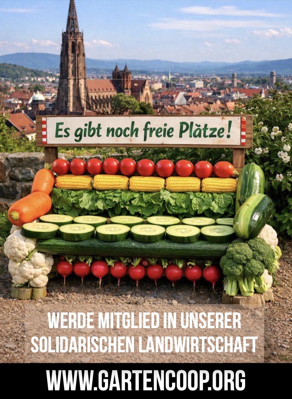 Dann werde Mitglied in unserer Kooperative. Es gibt noch freie Ernteanteile. In den Stadtteilen Merzhausen, Betzenhausen, Zähringen, Vauban, Unter-Wiehre, St Georgen sowie auf der Hofstelle in Tunsel haben wir noch Aufnahmekapazitäten.